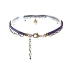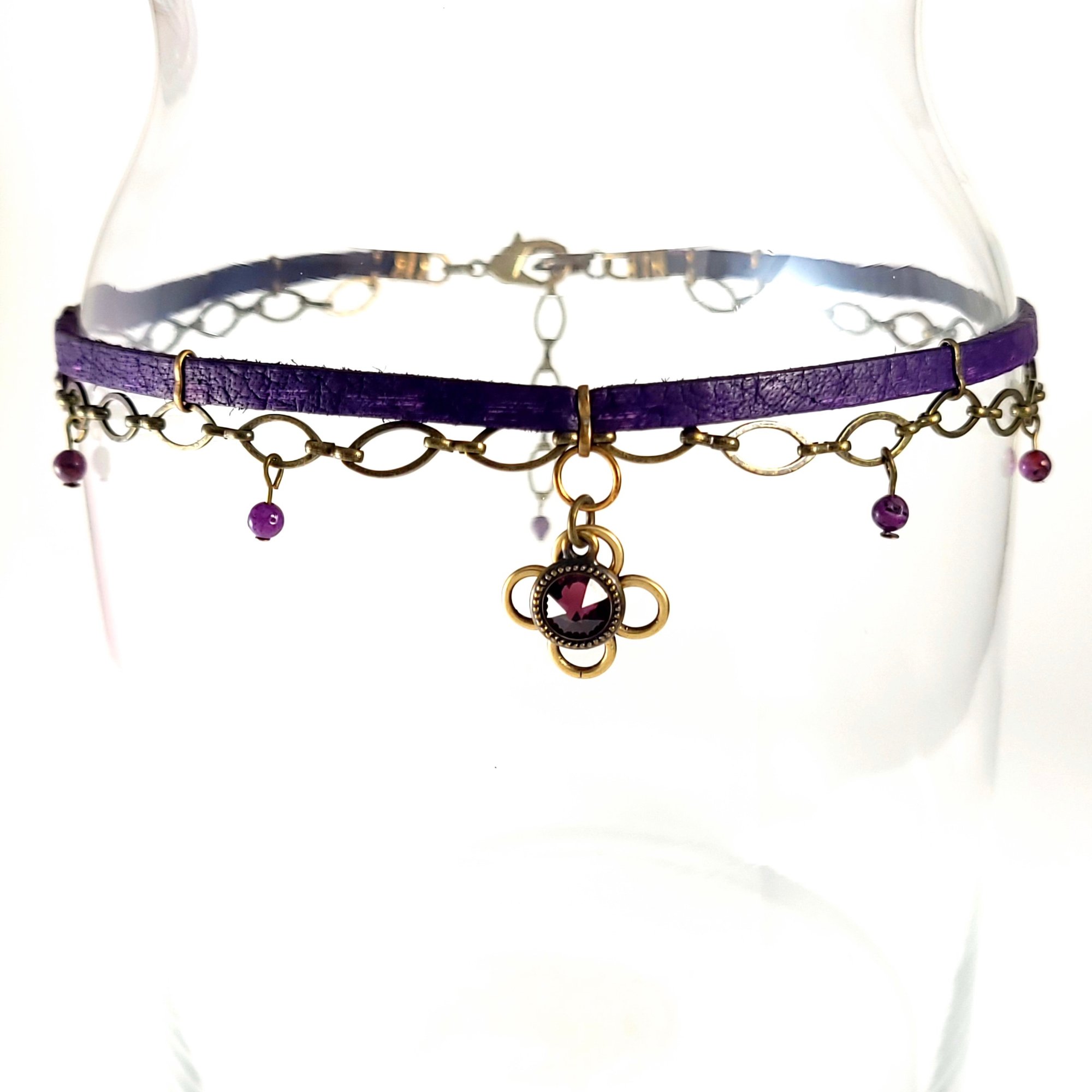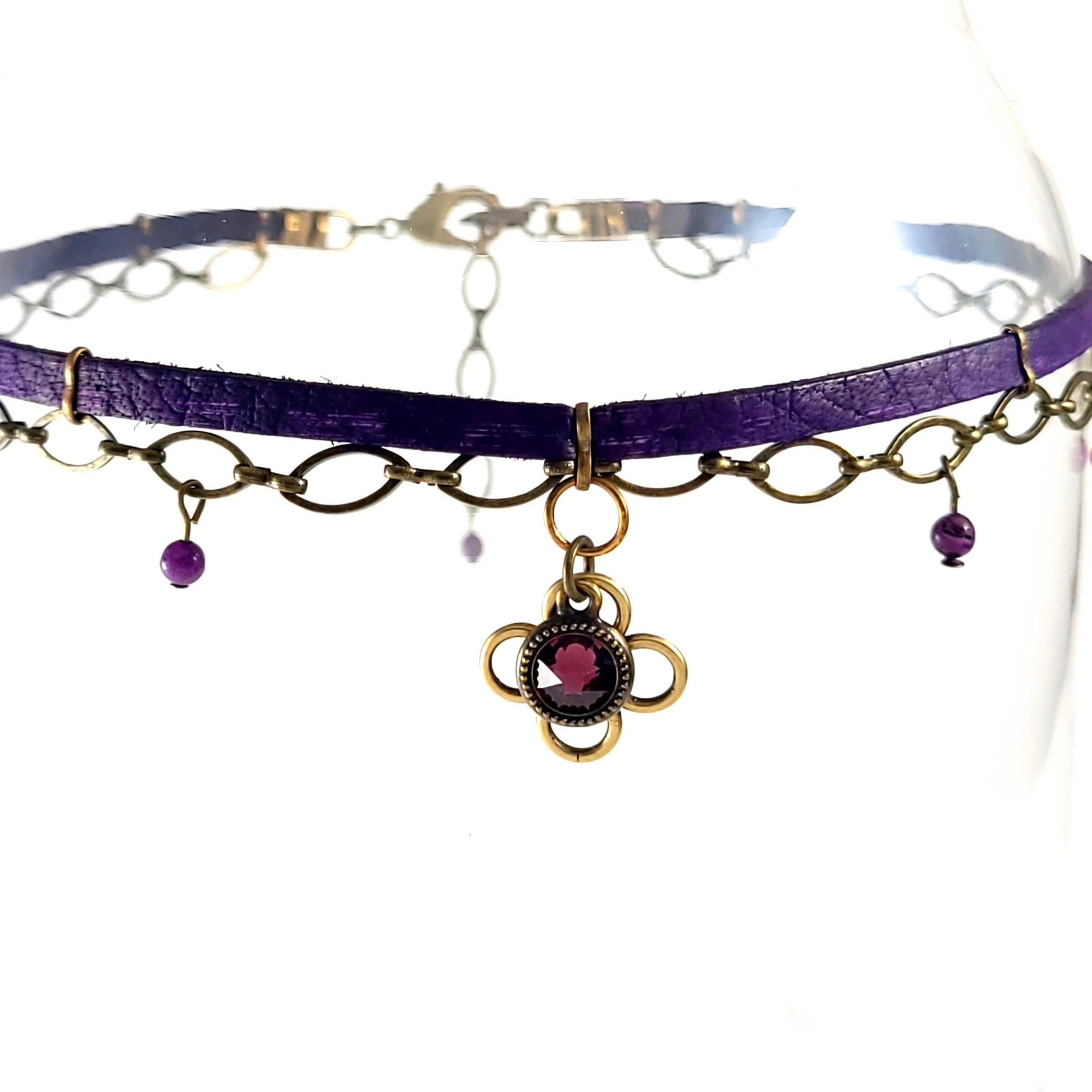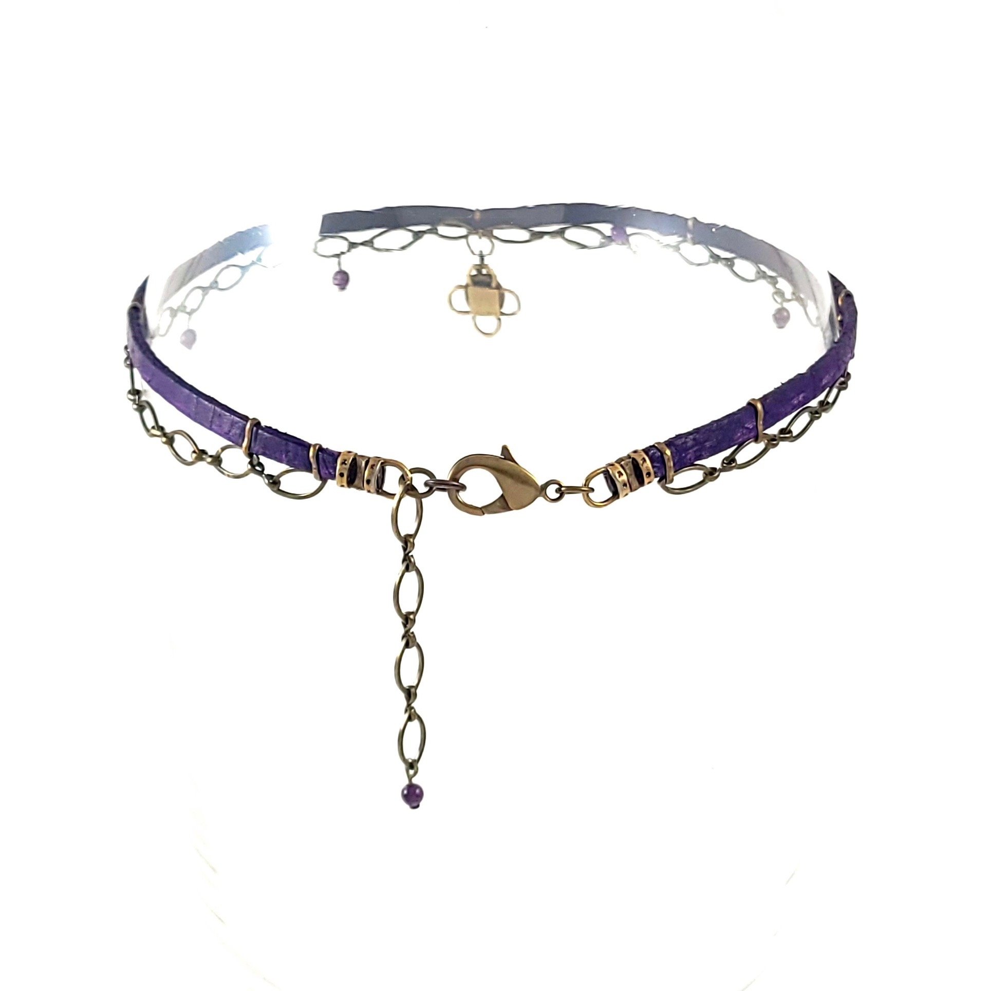 Casual with a touch of mystery. An amethyst crystal rests atop a brass clover on an antique brass oval chain and distressed purple flat leather (5mm), with purple glass beads.