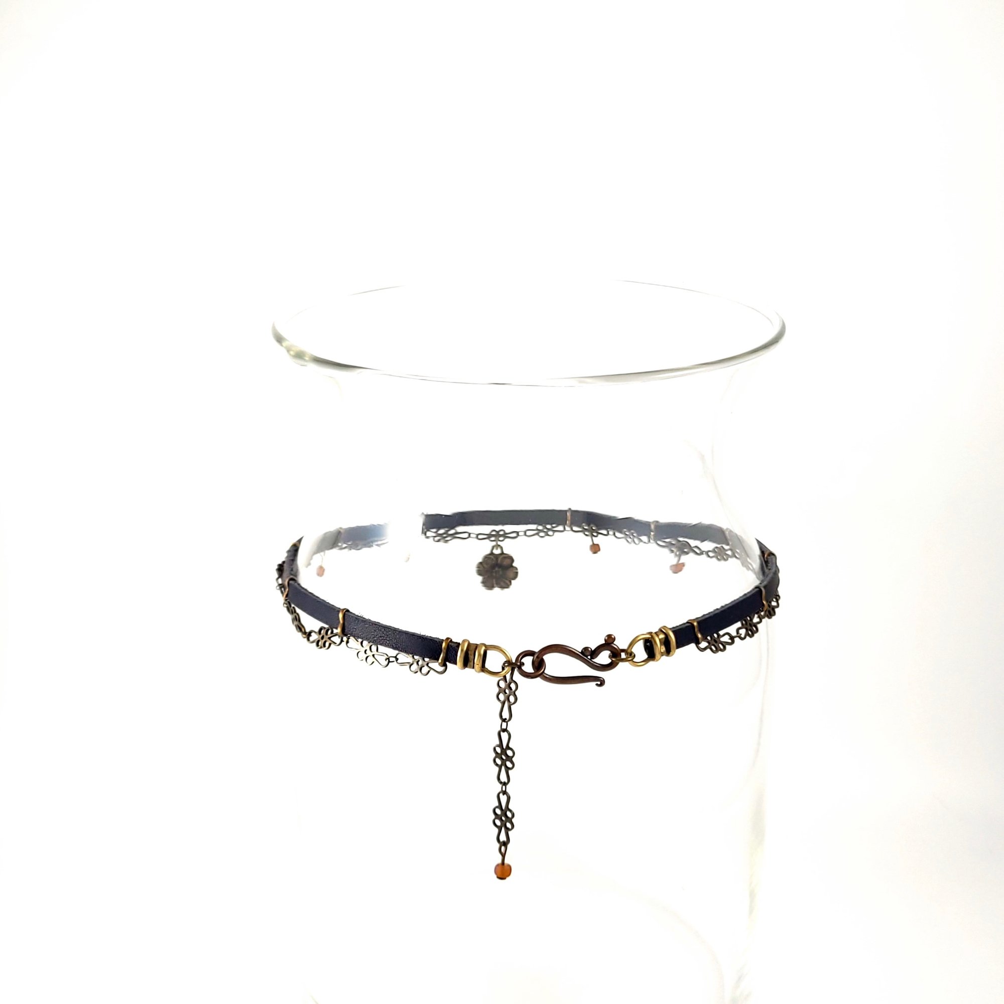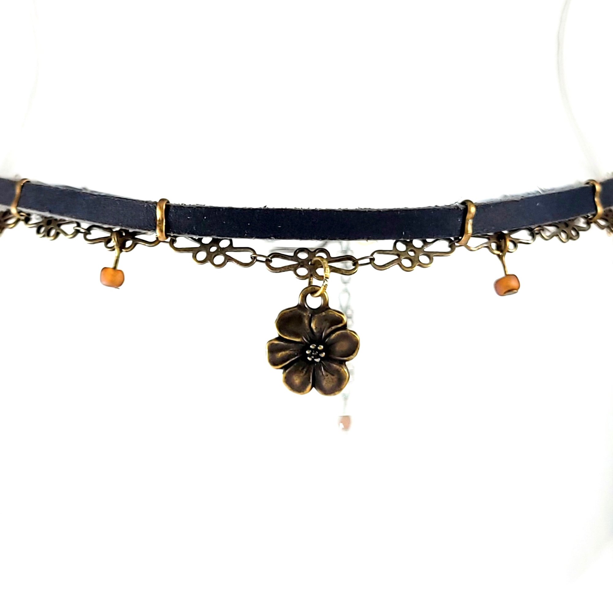 Black Leather and Brass Choker with Flower Charm