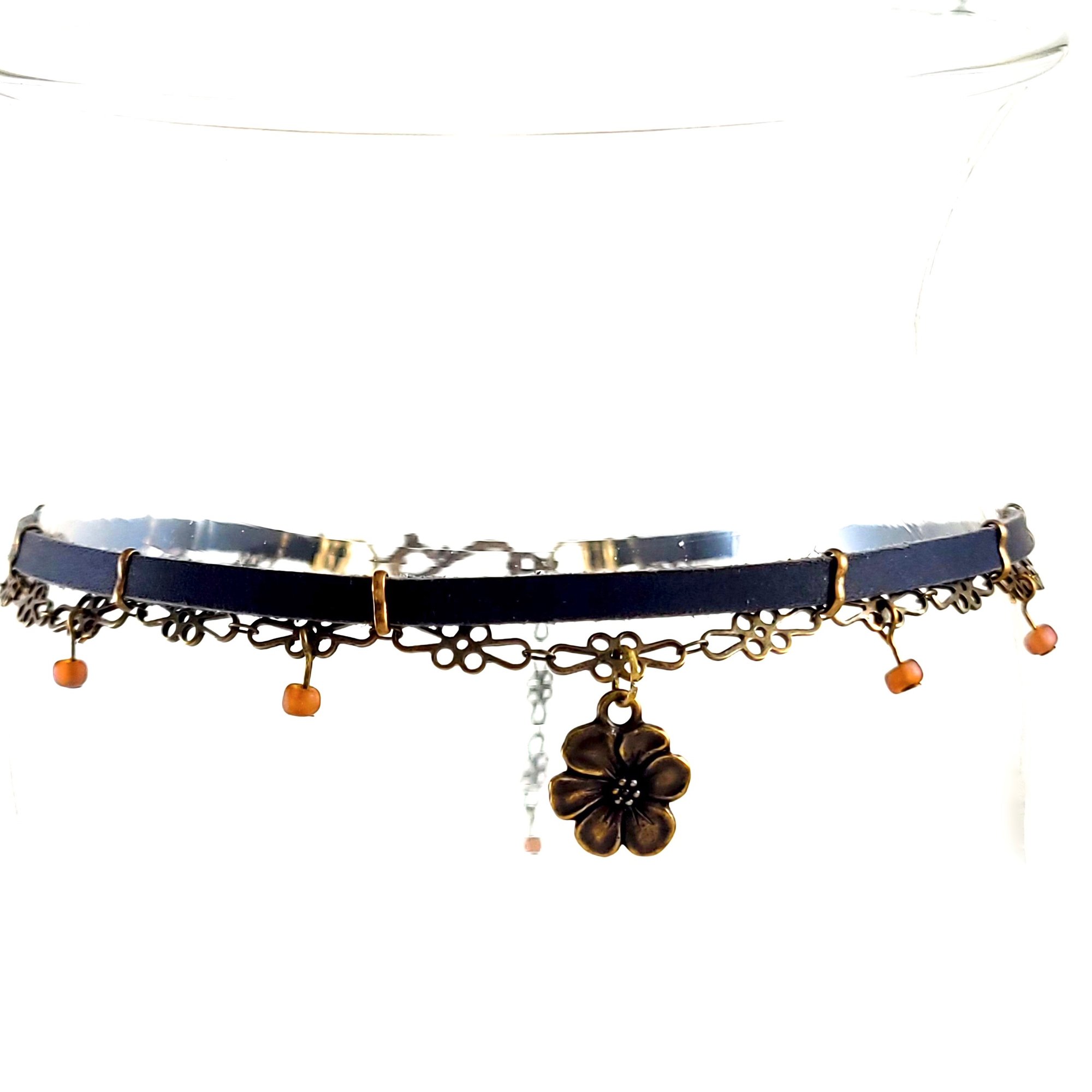 Muted leather and natural florals feature in this antique brass flower choker on a brass flower chain and matte black leather (5mm) with deep gold glass beads.