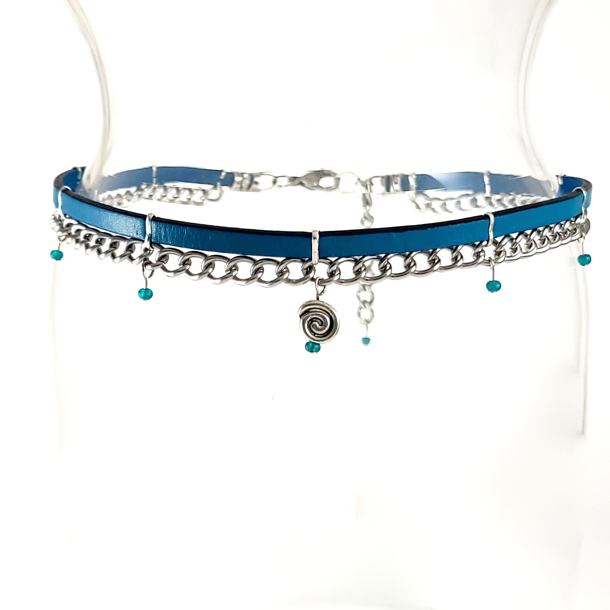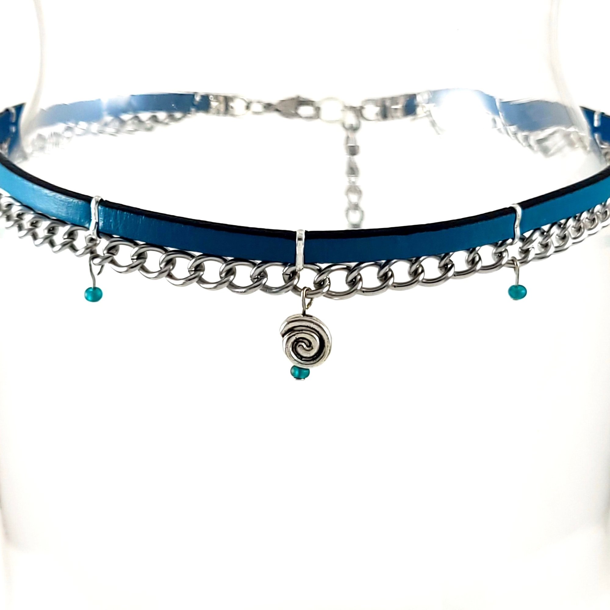 Turquoise Leather and Silver Chain Choker with Spiral Charm